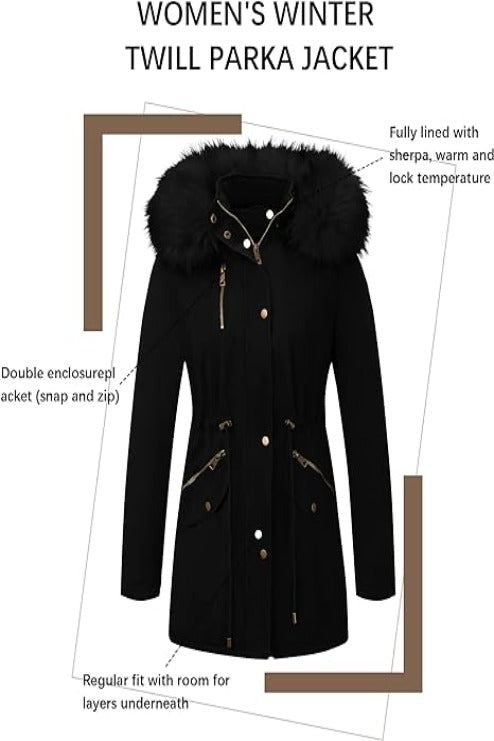 Bellivera Giacca parka in twill da donna, calda e alla moda per l'inverno, con cappuccio lungo e colletto in ecopelliccia